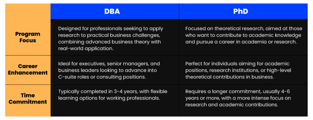 A DBA emphasizes practical, industry-driven research, while a PhD focuses more on theoretical and academic research.